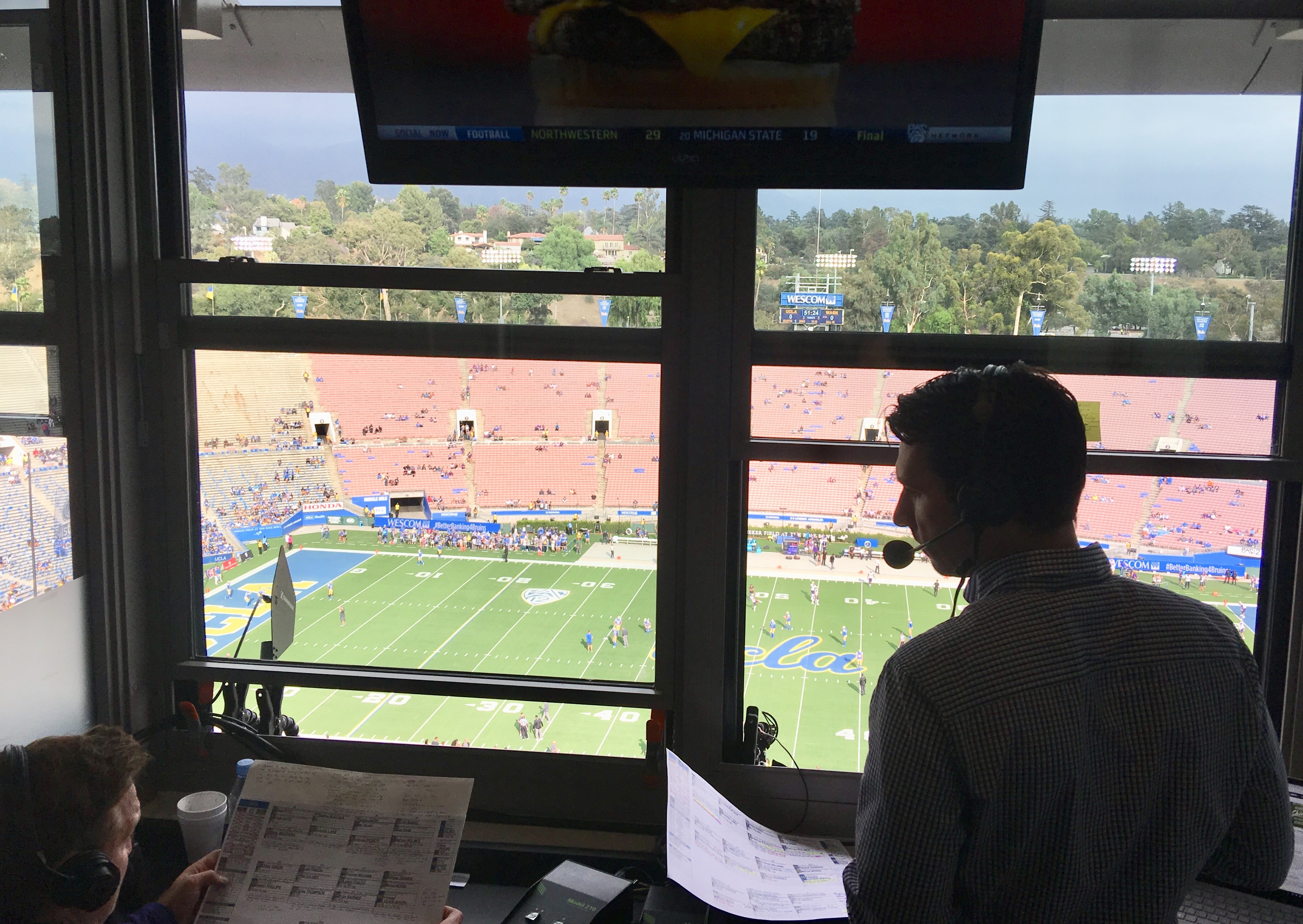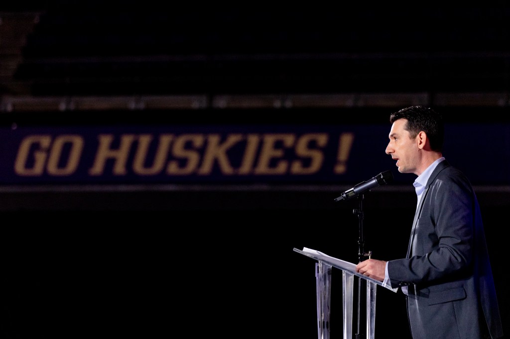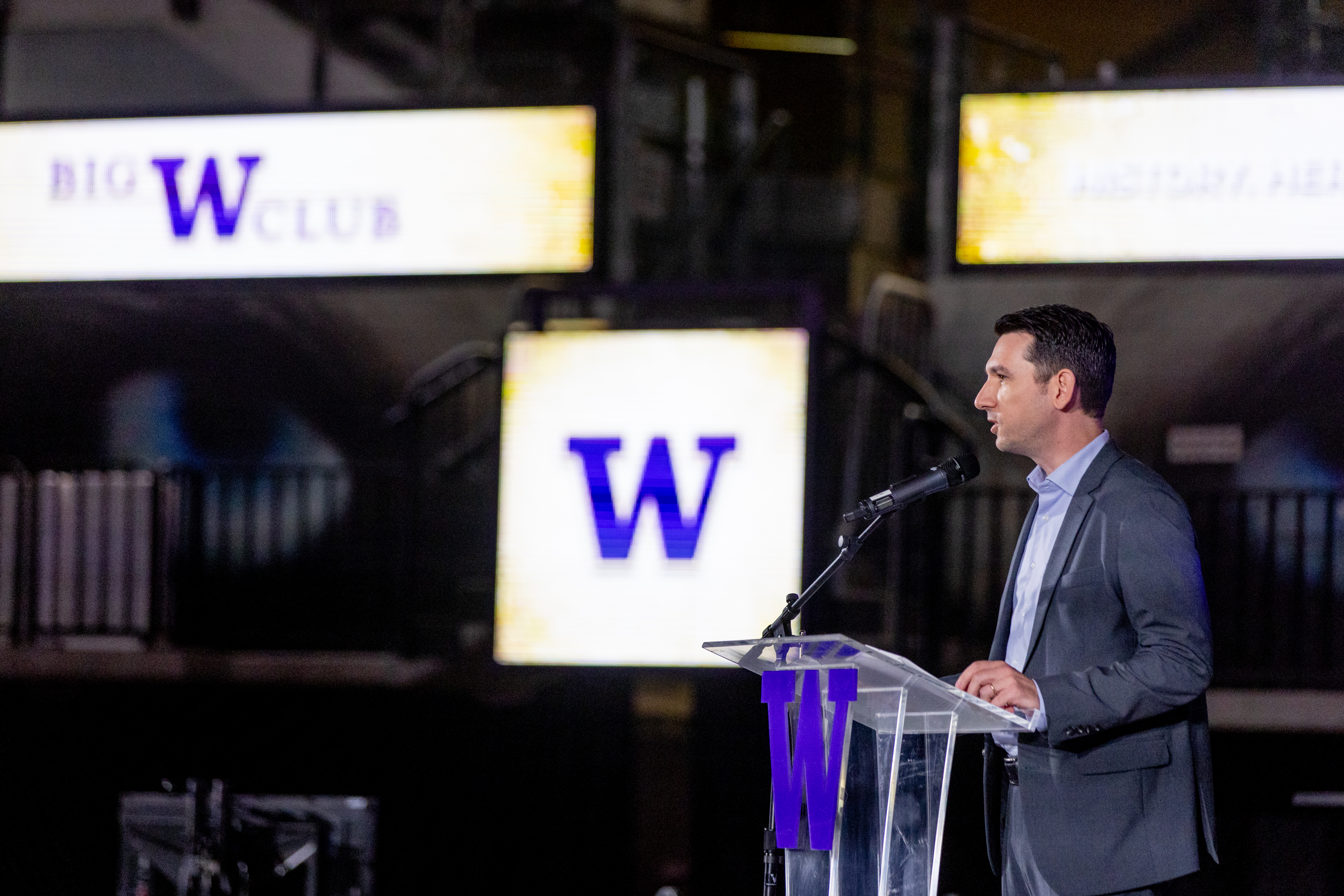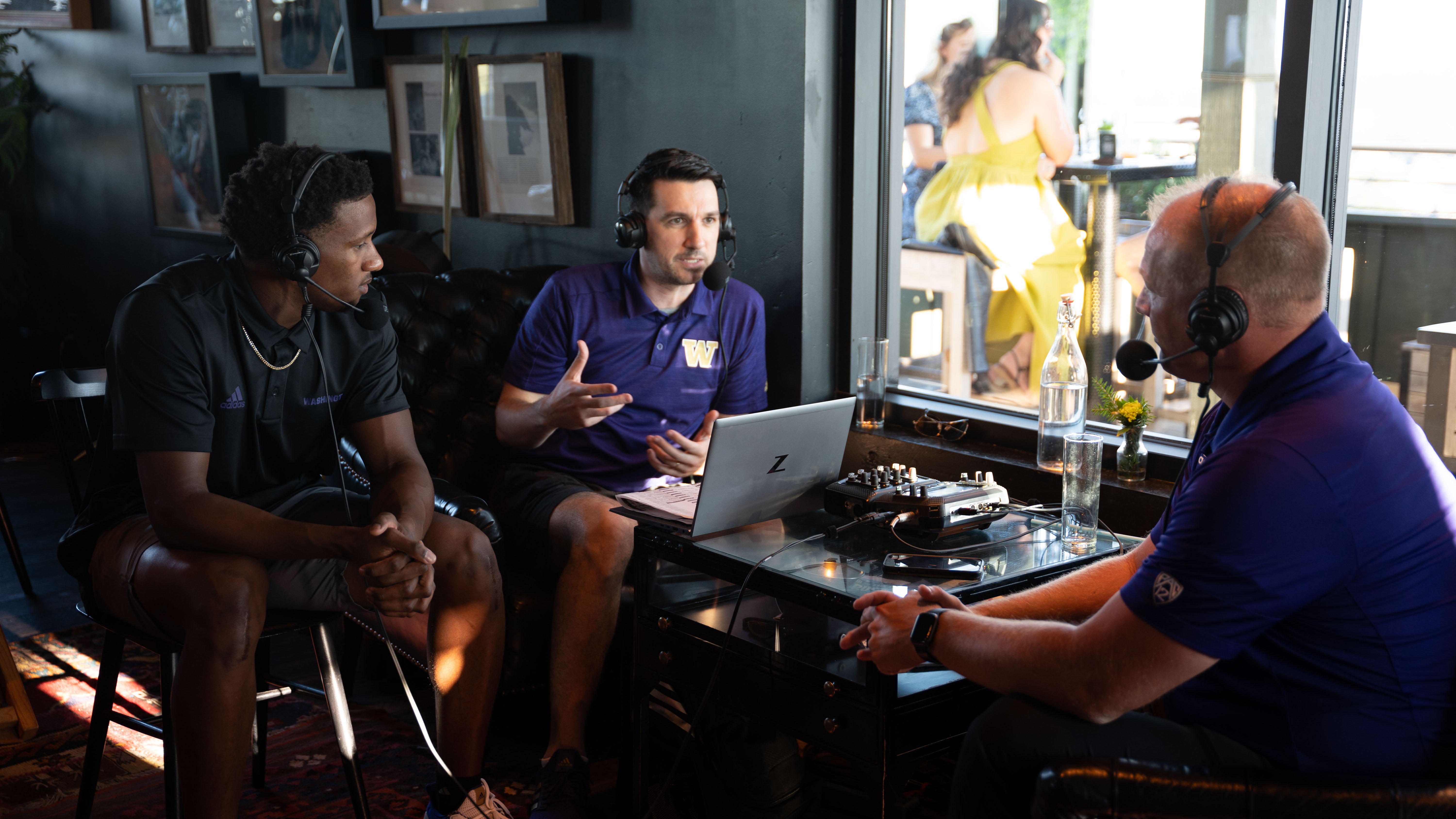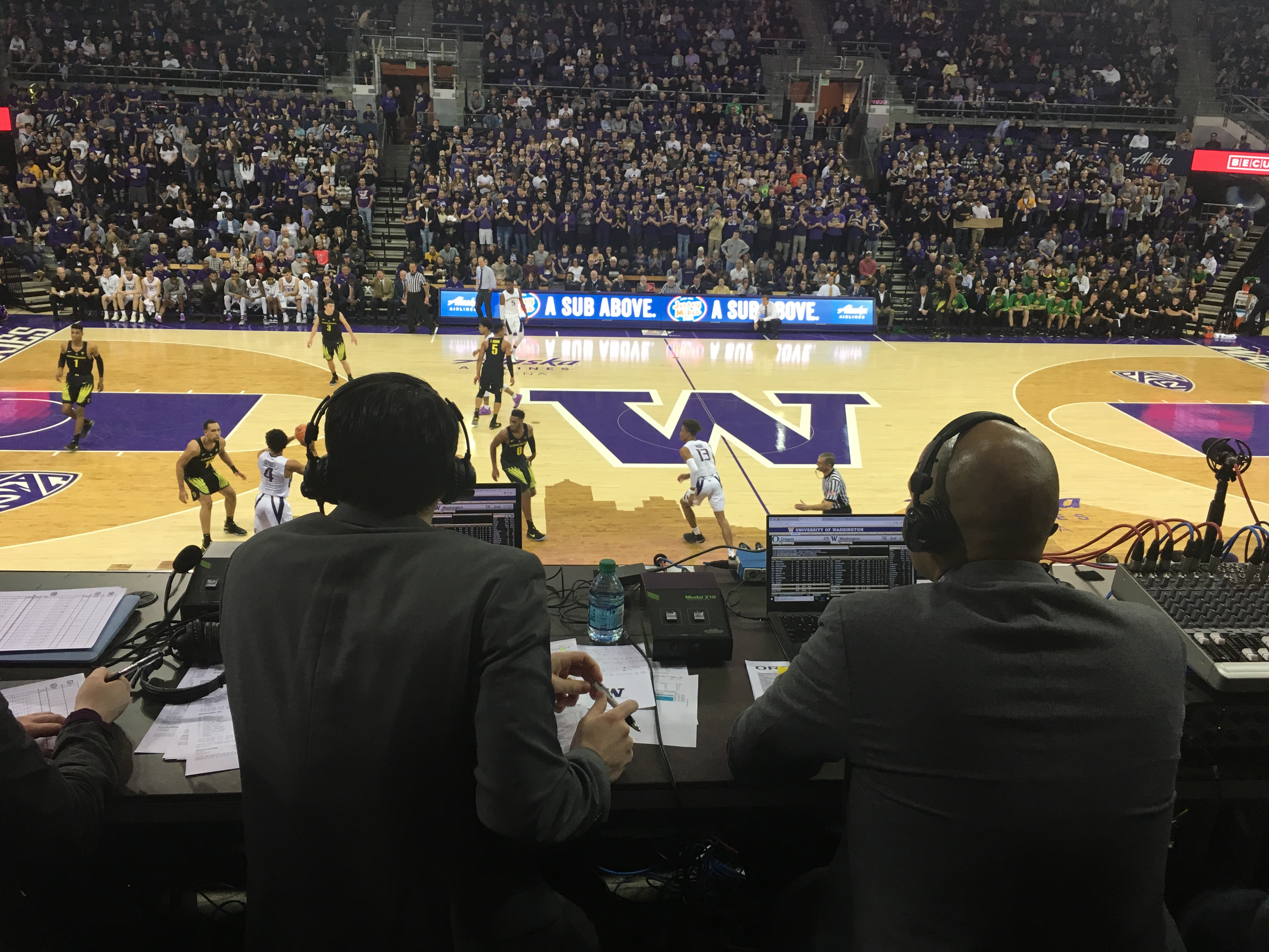 Emceeing the 2023 University of Washington Husky Hall of Fame ceremony. (Scott Eklund/Red Box Pictures)The 2023 University of Washington Hall of Fame ceremony at Alaska Airlines Arena on October 22, 2023. (Scott Eklund/Red Box Pictures)Calling Husky basketball with Jason Hamilton. (Scott Eklund/Red Box Pictures)With football analyst Cam Cleeland before Washington’s 2023 game against Utah. (Trevor Bond/Learfield)Interviewing Michael Penix Jr. at the Husky Football Coaches Show, live at the Mountaineering Club at The Graduate Hotel Seattle. (Christian Schuepbach/Learfield)Interviewing Michael Penix Jr. and head coach Kalen DeBoer at the Husky Football Coaches Show, live at the Mountaineering Club at The Graduate Hotel Seattle. (Christian Schuepbach/Learfield)Our view for Washington vs. Oregon basketball to wrap up the 2018 Pac-12 season.Hosting pregame of Washington at UCLA from the Rose Bowl in 2018 with former Husky Damon Huard.